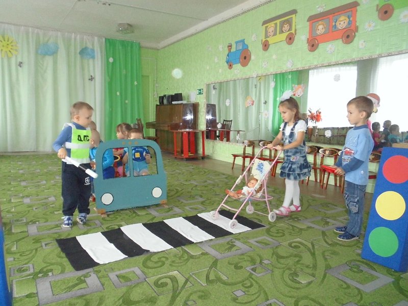 В каждой группе имеется уголок дорожного движения, в котором представлен макет перекрестка, дидактические, настольные игры и атрибуты для сюжетно - ролевых игр. Педагоги знакомят детей с темами: «Дорожные знаки», «Транспорт», «Светофор», «На перекрестке», «Пешеходы на улице».